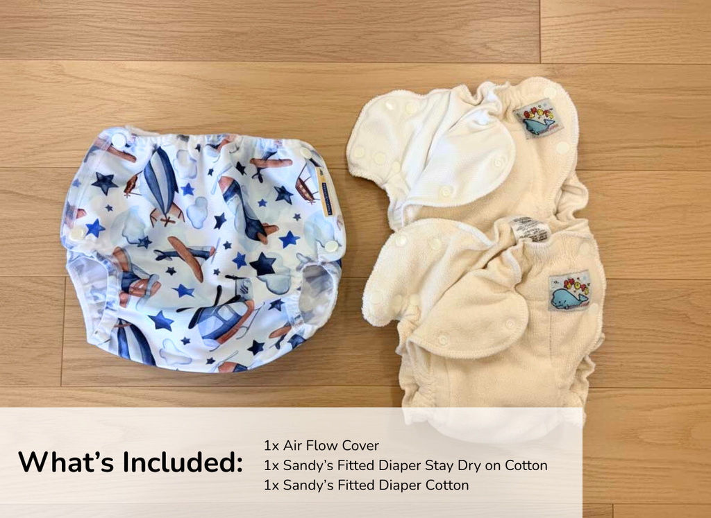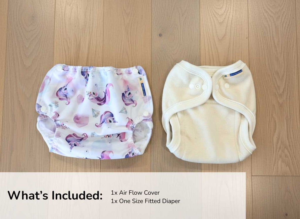 Fitted cloth diapers are a two-step system, in that the absorbent diaper and waterproof cover are closed around your baby in two separate steps. (see video above)